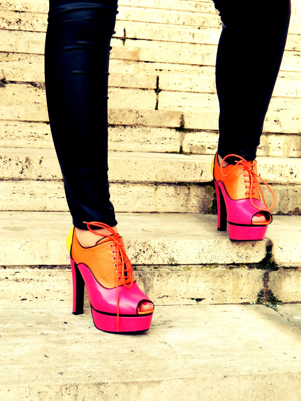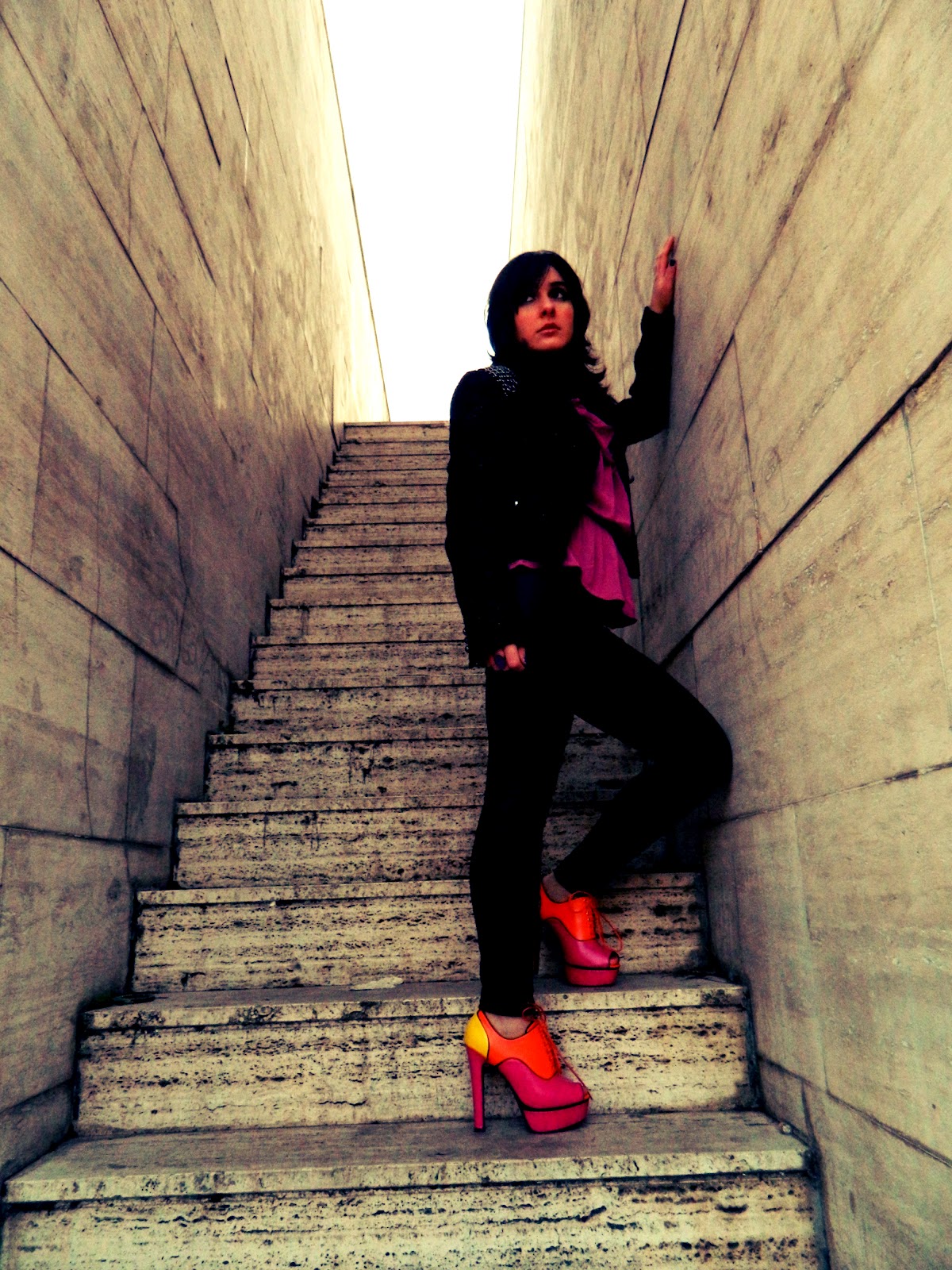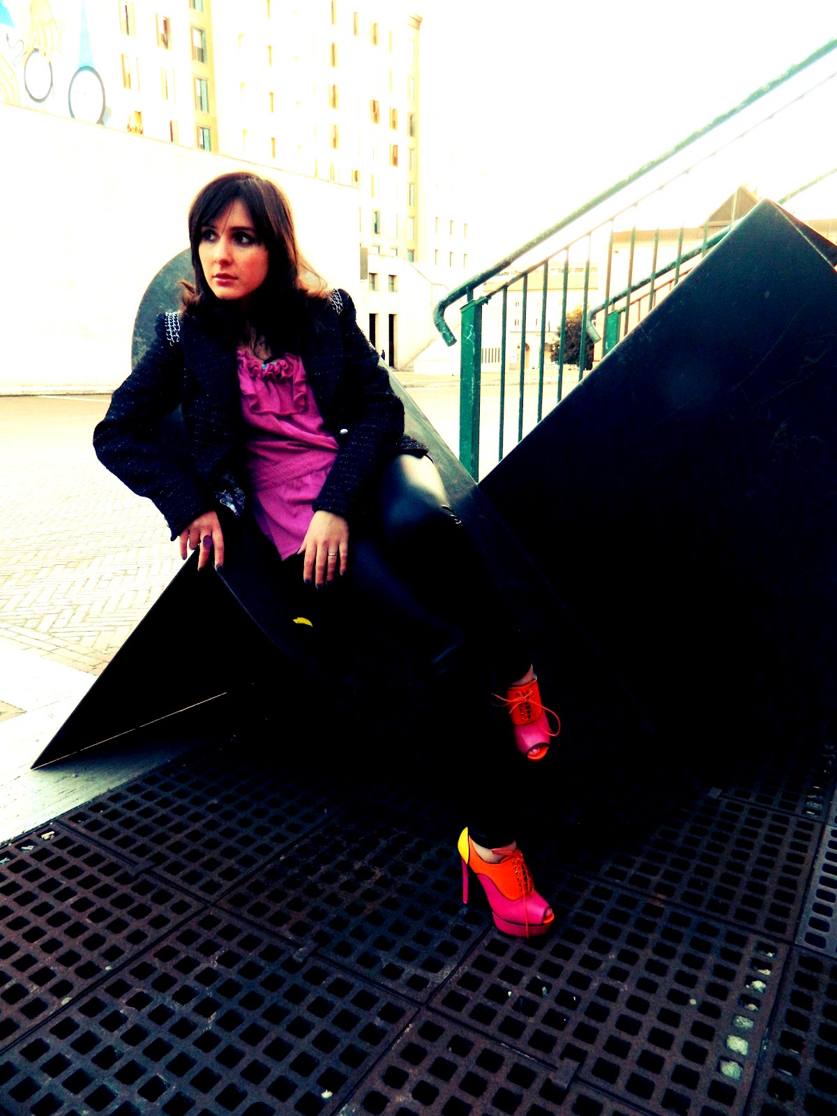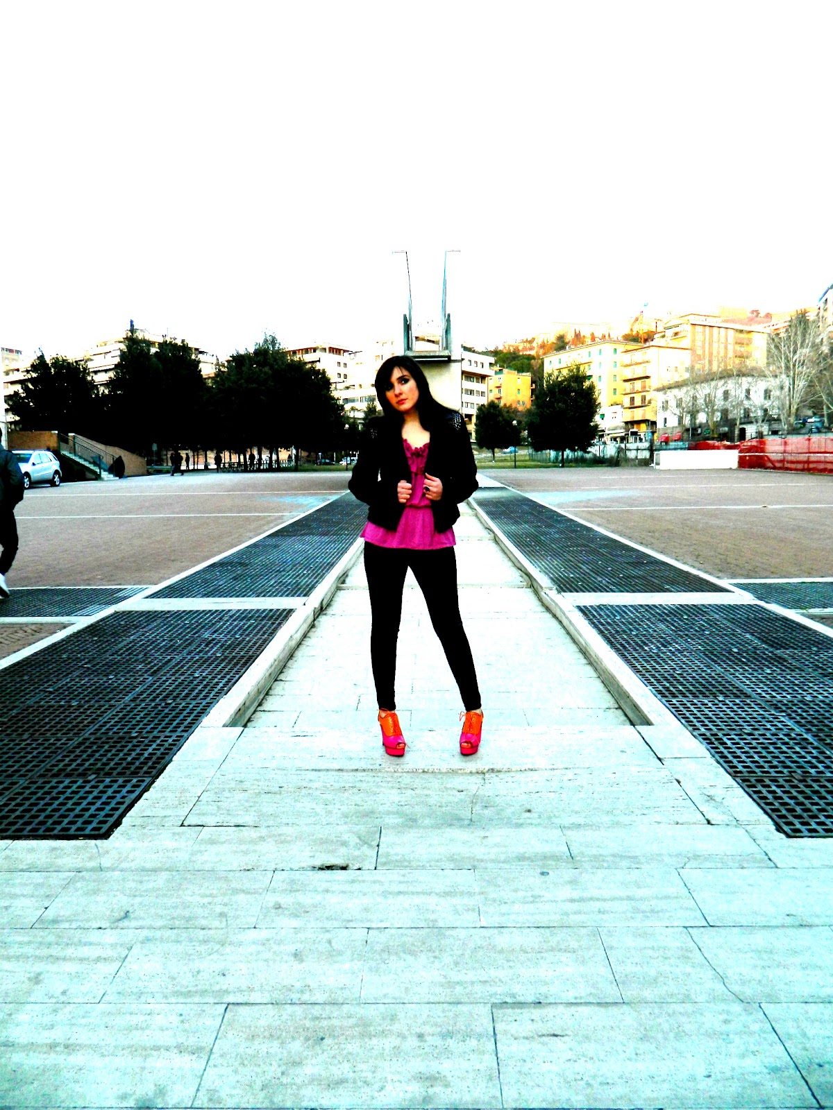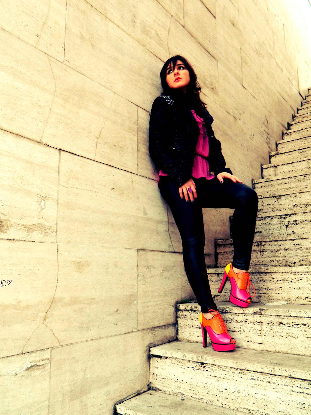 My dear Fashionistas!like i promised here at last my outfit with the Licean Shoes!In this photos i’m in a very particular square of Perugia.It’s very very interesting because have a metaphysical style and i think that for this look is so perfect!well also if the shoes are very pop i’ve opted this time for the use of black,that makes in my opinion,more glamourous all the composition.I’ve also a new guest star to present to you,my new Guess Jacket,inlayd by on straps by small chains!i’ve bought it on this last sale,and in addition to being wonderful it was also a very occasion!and don’t worry if here is it’s not very visible soon i’ll do another post with it!;)Let us now to the highlight,my pop Licean,that are my favourite item in this period!i love it and i’ll hope to use these very mych this spring!!!