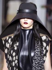Non si poteva vedere molto dei volti delle modelle sotto i cappelli alla Darth-Vader di Balenciaga, ma ciò che spicca sono sicuramente le labbra nero-ciliegia superglossy. La tonalità, tra le più profonde utilizzate quest’anno in passerella, sembrava ancora più intensa messa a confronto con la pelle pallida delle modelle, sottolinenando il tema futuristico della collezione.