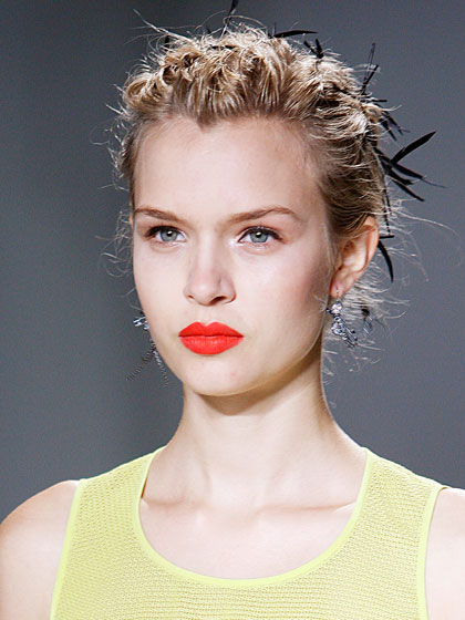 Labbra e Unghie dello stesso colore? Perchè no! Se fatto bene può essere un opzione da non sottovalutare. Il consiglio è di utilizzare un colore inaspettato, come l’ arancio-rosso brillante come quello utilizzato per la passerella di Jason Wu. Sulle labbra ecco un mix di M.A.C. Lip Pencil in Redd, M.A.C. Rossetto in Scarlett Ibis, e M.A.C. Colour Powder Pigment in stile neo-Orange, mentre per le dita è stato utilizzato uno strato di smalto OPI.