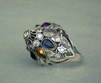 Le 9 pietre a corredo sono tutte genuine: Ametista, Citrino, Granato, Peridoto, Quarzo rosa, Zaffiro, Spinello nero, Topazio blu e, come chicca finale, un inconsueto Topazio incolore in cima all’anello, quello destinato eventualmente ad esaudire l’ultimo desiderio prendendo colore. Piccoli cubic zirconia (sintetici) disposti in 2 cerchi arricchiscono il tutto.  Parrini…Quando si dice che la bellezza è senza tempo…