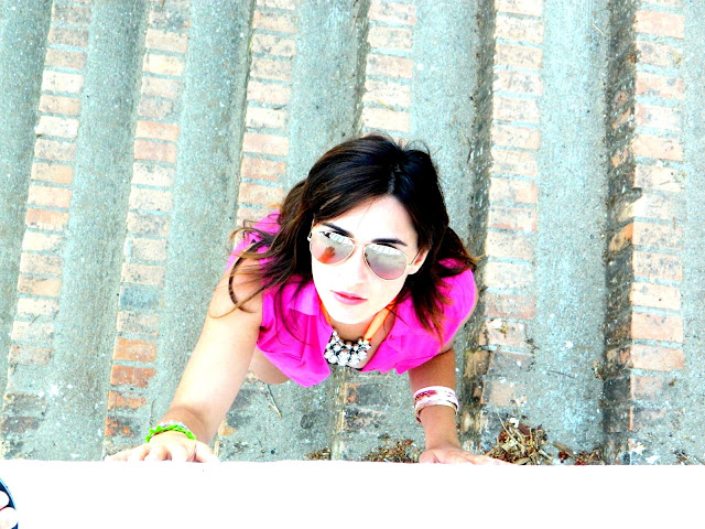 Sweetness! How long! I apologize for the absence, but also the bloggers go on vacation 🙂 Yeah, a week of peace could not make me nothing but good, although, I admit, I missed you so much, now I can not do without our daily space eh .. already. My virtual suitcase was once again transformed into a real heavy load full of clothes, costumes and sunscreen, accompanandomi the time of the goal of the session, the Copanello beautiful, beautiful beach in the province of Catanzaro (therefore always in my beloved Calabria). But do not believe that you have forgotten! Between a swim in the sea, nights out, entertainment, and splashing in the pool, I thought of you, my dear, snapping a few pictures to show you on my return. So begin today to keep the promise. The logic would have wanted you first showed you my diary today but my dear, I feel creative, and putting aside everything, I decided to go with an outfit previously announced premiere on Facebook a few days ago, which provides a look 80 ‘, which finds its key pieces in the shirt Fuchsia Fluo Stefanel and the beautiful aviator Ray-Ban, on the occasion of the celebration of the historical spectacles, which now make 75 years (brought great!). But what I‘m going to show today will be more than a simple outfit … you read the title? Today the word is better if psychedelic color…judge for yourselves! tout pour vous …on Dans la Valise..