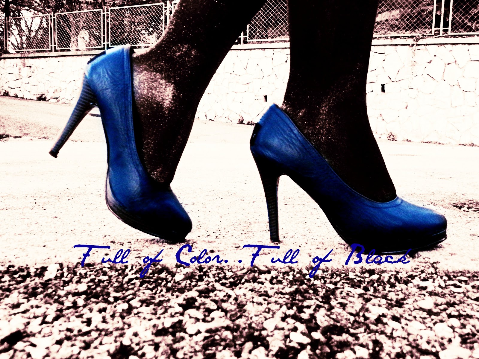 Really great ensemble, especially the gorgeous texture of those tights with those blue shoe and the handbag. Love it!