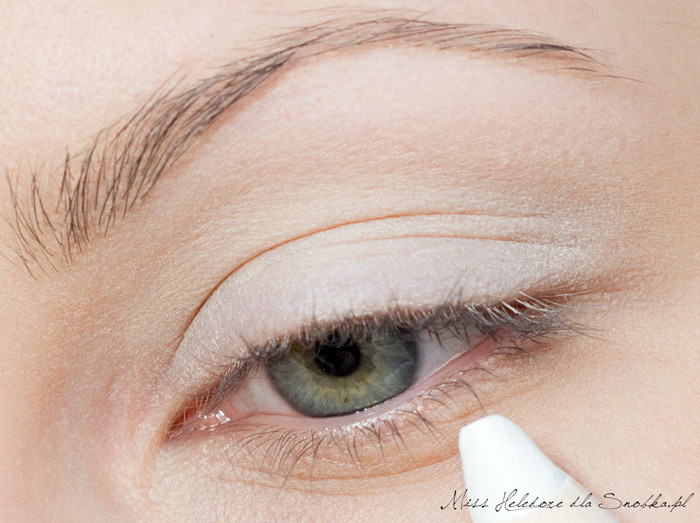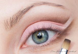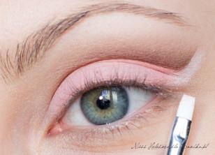Cominciate il vostro Make-up partendo dalla copertura di tutta la palpebra superiore fino al sopracciglio, con una matita bianca morbida. Sfumate accuratamente in modo da farla diventare una base perfetta per il nostro rosa.