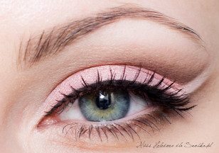 In un angolo esterno dell’occhio, all’altezza della linea interna, applicate un rosa più scuro, opaco, mescolato con un po ‘di marrone medio. All’estremità dell’angolo portate il colore verso l’alto con una linea netta, così come vedete in foto