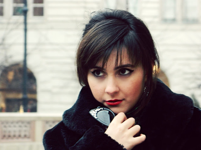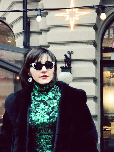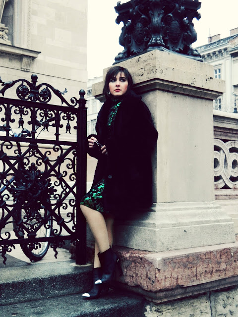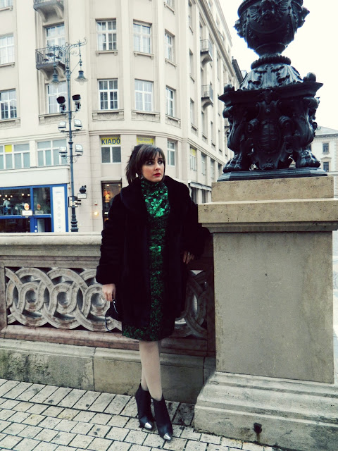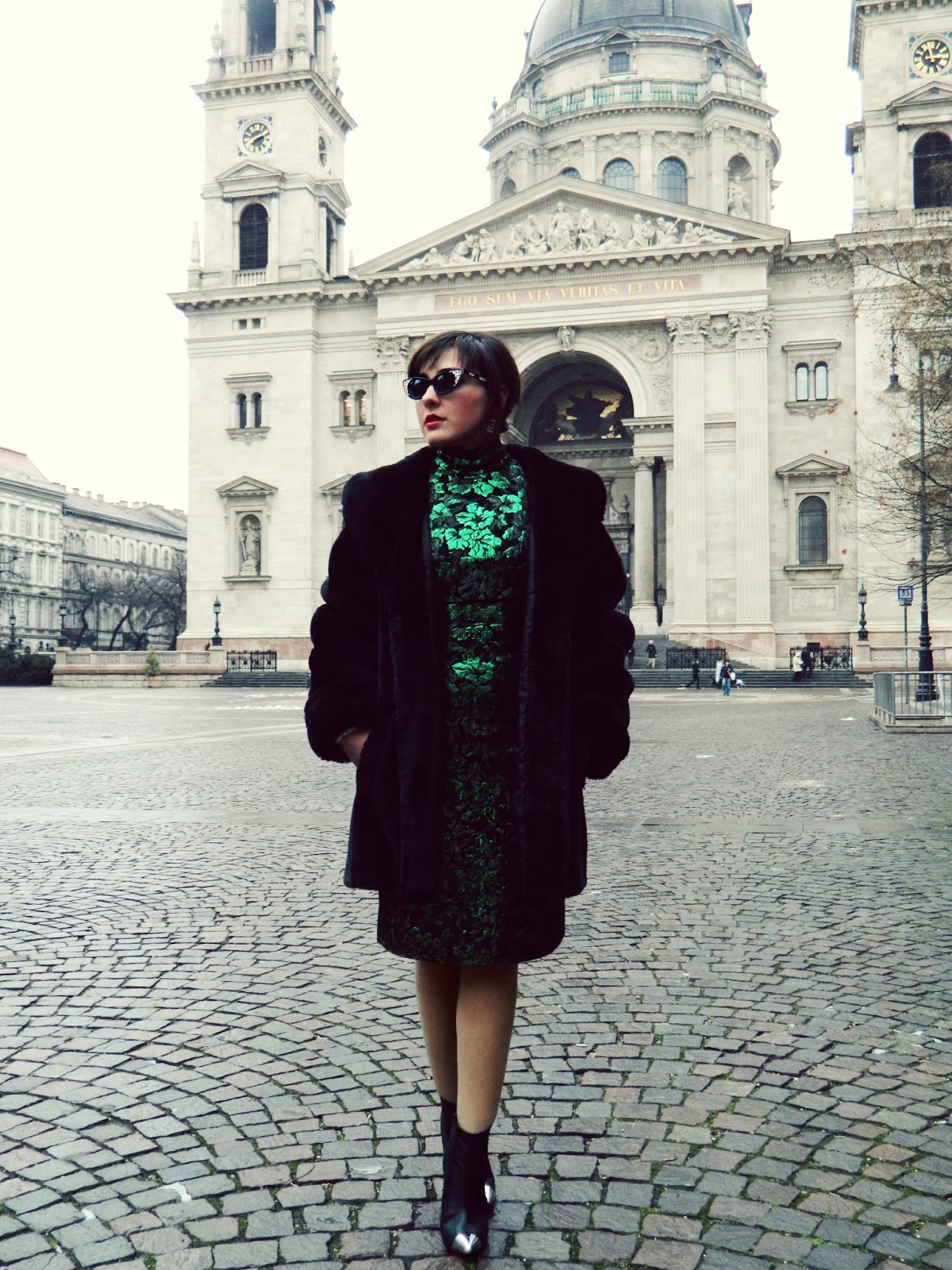 Feline glasses, inevitable fur, heels and a bit of green. These are the ingredients of this second “Hungarian”outfit, where my background’s shooting is not the beautiful Chain Bridge that you see in the previous post (do you missed? Can find it HERE) but Szen Istvan‘s Basilica with its beautiful square, lit every night from a wonderful retro lights and the cozy rooms and quiet. Our second day in fact, was focused to discover the beauty of the old Pest, despite the cold and the snow, which gave us no respite. As you can see from the atmosphere of these shots, the gray sky was not lacking, but fortunately our tireless joy rekindled the day, not to mention a visit to the famous Heroes’ Square, with its endless parks, and some delicious typical that there has heated. The look is deliberately chosen refined but at the same time thanks to the daring dress (sleeveless under the fur .. brrr) and these Polaroid sunglasses that give me a diva style that i found for this outfit.