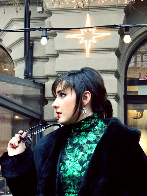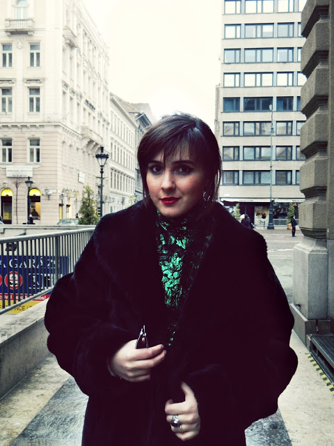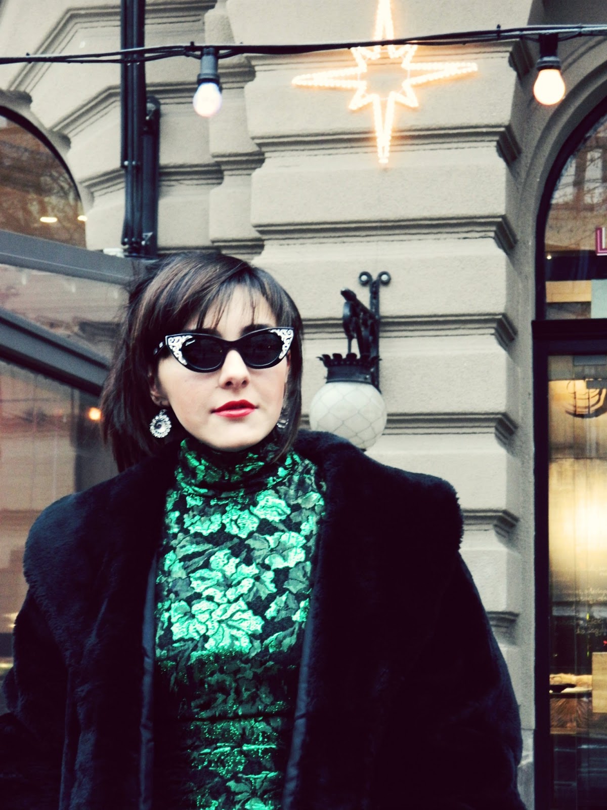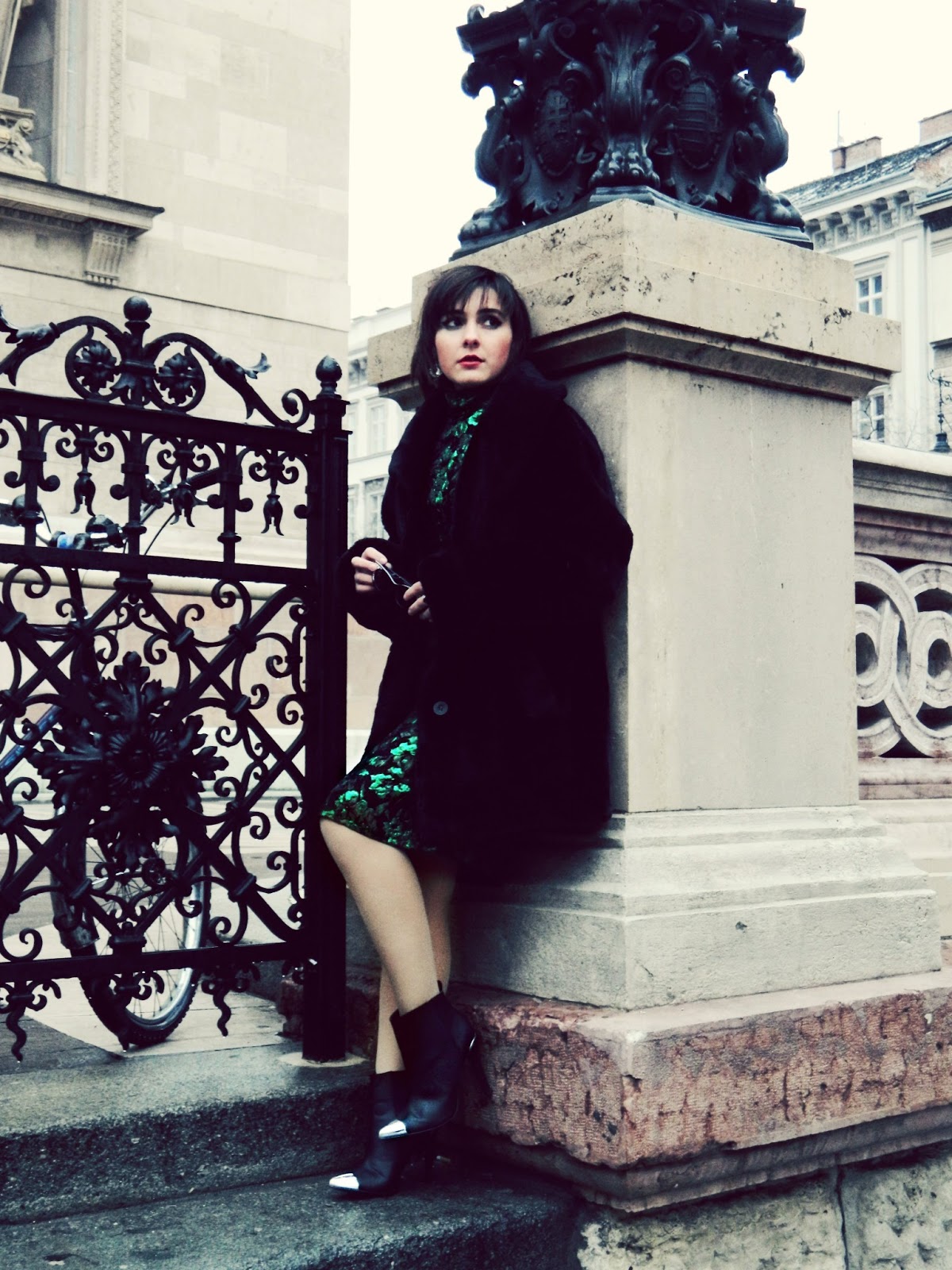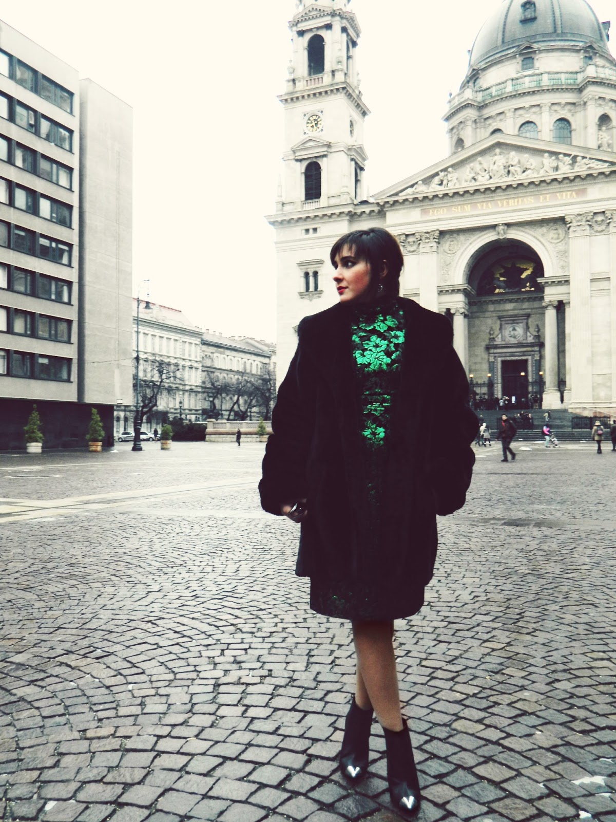 Occhialoni felini, pelliccia (immancabile) tacchi e un pò di green. Questi sono gli ingredienti di questo secondo outfit tutto “ungherese”, dove a farmi da sfondo non c’è più il bellissimo Ponte delle Catene ( ve lo siete persi? Lo trovate QUI) ma la Basilica di Szen Istvan con la sua bellissima piazza, illuminata ogni notte da stupende lucine retrò e dai suoi locali accoglienti e tranquilli. Il nostro secondo giorno infatti, è stato incentrato alla scoperta delle bellezze della vecchia Pest, nonostante il gelo e la neve, che non ci ha dato tregua. Come potrete notare dall’atmosfera di questi scatti, il cielo grigio non mancava, ma per fortuna la nostra instancabile allegria ha riacceso la giornata, per non parlare della visita alla celebre Piazza degli Eroi, con i suoi parchi sconfinati, e qualche prelibatezza tipica che ci ha riscaldati. Il look scelto è volutamente raffinato ma allo stesso tempo audace grazie al vestito (smanicato sotto la pelliccia..brrr) e questi occhiali Polaroid Cat Eyes, che danno subito quell’aria da diva che tanto ricercavo per questo outfit.