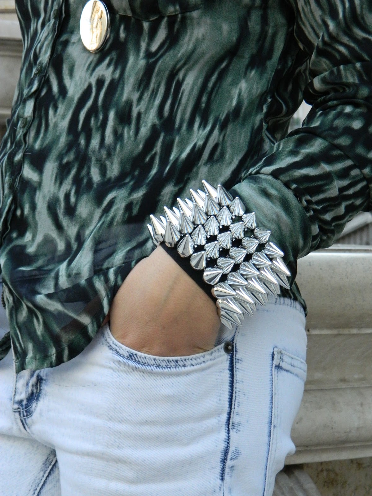 Hi sweetness! I’m glad to show you my third outfit set in Budapest, an outfit very Street & Rock. I love this look because is created with the purchases that i buy around this beautiful city. Different are the items and accessories that i’m happy to show you, in this green and white look. At first my wonderful New Yorker shirt, purchased in the beautiful Vaci Street, the more important street of fashion of Budapest, with its shops, boutiques and the latest in fashion factor and the like. A purchase really well done, and for the strong mood of these contrast green, very military chic, and the beauty of this simple piece. Another detail that I love is the studded bracelet, bought in West End, one of the largest shopping centers in Central Europe, that won me over at first glance and that I could not wear an outfit so urban like this. And let’s face it all, with this whimsical clutch C & A with embroidered skulls (also purchased at the West End) goes well! To top it all white skinny jeans, studded lita and the streets of this magnificent city that stole my heart…