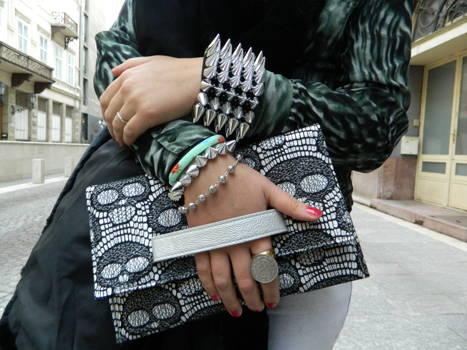 Ed eccomi al mio terzo outfit fuori casa…e questo rispetto agli altri è decisamente più Street&Rock. Senza contare che è stato decisamente creato in base agli acquisti fatti in giro per la città. Diversi sono i capi (e gli accessori) che sono felice di mostrarvi in questo look green and white, prima fra tutti la camicia New Yorker  acquistata nella splendida Vaci Utca, la via commerciale più “In” di Budapest, con i suoi negozi, le boutique e le ultime novità in fattore moda e simili. Un acquisto davvero ben fatto, sia per il mood strong di questi verdi a contrasto, molto military chic, che per la bellezza di questo capo semplice, ma d’impatto. Altro particolare che adoro è il bracciale borchiato, acquistato a West End, uno dei centri commerciali più grandi dell’Europa Centrale, che mi ha conquistato al primo sguardo e che non ho potuto non indossare per un outfit così urban come questo. E poi diciamocela tutta, con questa clutch stravagante C&A con teschi ricamati (anche questa acquistata a West End) si sposa benissimo! A completare il tutto jeans skinny white, lita borchiate e le strade di questa splendida città, che mi ha rubato il cuore…