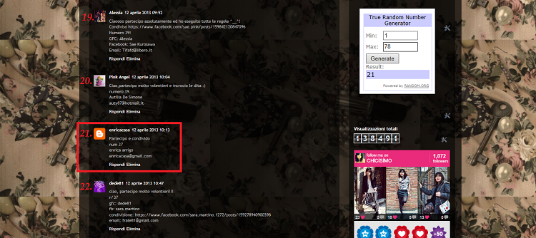 Ragazze!!! Allora? siete curiose di sapere il nome della fortunata vincitrice di queste splendide Glam Slippers firmate Bedrooms Athletics?!? I commenti arrivati sono stati davvero tantissimi, e l’entusiasmo sia qui che su facebook si è fatto molto molto sentire! Il sorteggio, come potete vedere, è stato fatto non tra gli 81 commenti segnati sul post ma su 78, in quanto tre commenti sono “precisazioni” di ragazze che avevano già commentato, e quindi non sono stati considerati al fine del conteggio. Ma andiamo subito a svelare il nome della nostra fortunata. Queste fantastiche Glam Slippers sono state vinte da Enricacasa! con il commento numero 21, selezionato dal sistema Random.Org (come potete vedere dall’immagine in basso). La vincitrice sarà contattata in privato via mail a breve così da poter ricevere a casa questo bellissimo premio.