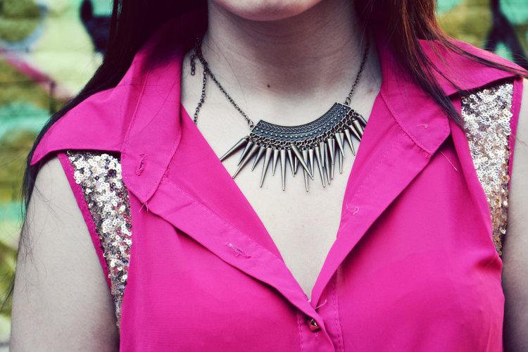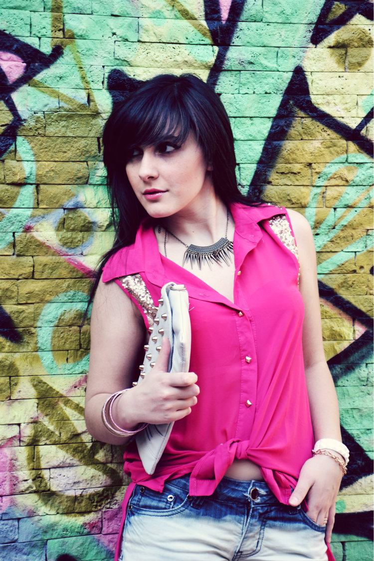 Paillettes e un tocco di rosa. Sono questi gli ingredienti principali del look di oggi. A parte gli shorts..perchè quelli no, non possono mancare. Oggi sarò essenziale, breve e coincisa. A volte serve far parlare le immagini, così, tanto per non influenzare troppo in fretta qualche giudizio. Armata di allegria sono uscita e ho scattato queste foto, ora che l’estate è arrivata anche qui, tra le mura di Perugia..ed è così che tra un murales e l’altro, tra bagliori di rosa, mi sono vestita di luci e colori..ribelle? forse…ma con un anima…