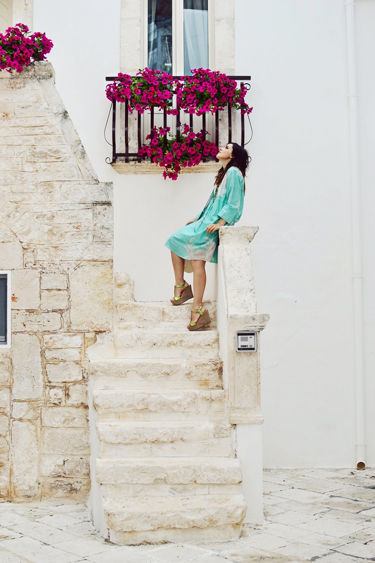 Molto belli questi scatti: il contrasto del color menta del tuo splendido caftano con lo sfondo candido dei paesaggi pugliesi mette in evidenza la tua bellezza! Complimenti *_*