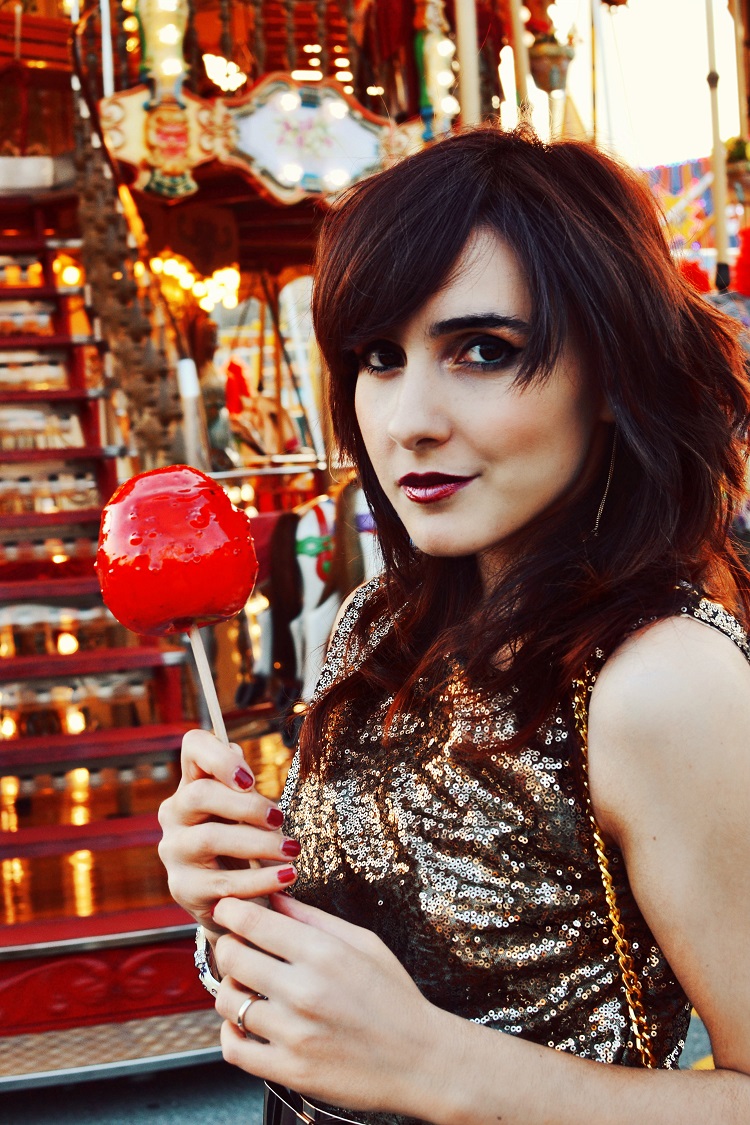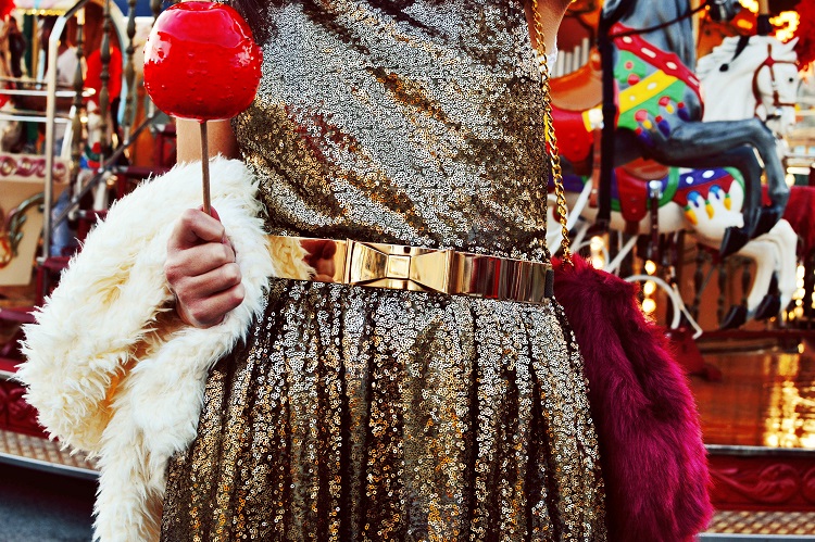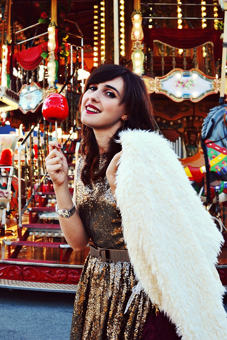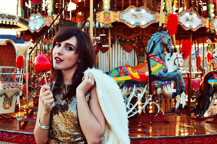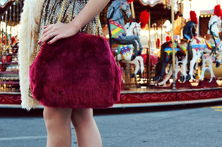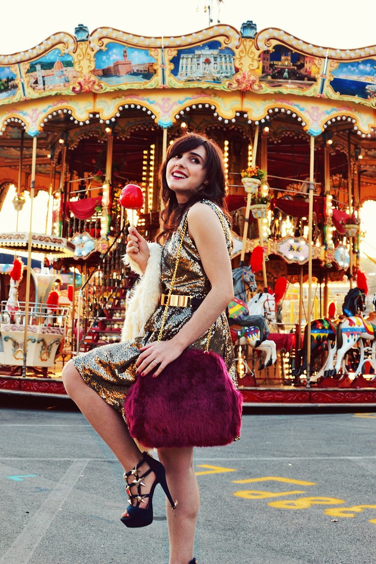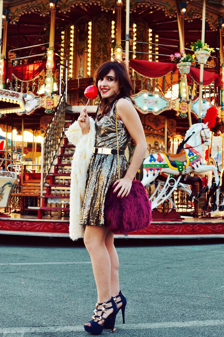 Ci sono shooting che ti rimangono nel cuore, shooting che nascono spontanei, come una domanda. Ha aperto il Luna Park in città, andiamo a fare un giro? A volte l’ispirazione può nascere così dal nulla, dalla più piccola parola, per prendere forma e trasformarsi con il passare dei secondi e dei minuti, sino a diventare un pensiero fisso, una scommessa. Ed è così che nasce il servizio di oggi, scattato in un mega parco giochi a pochi passi da Perugia, un parco giochi così affollato che ci sono volute ben due ore per riuscire a ritagliarci il nostro angolo di pace. Ma ne è valsa la pena sapete. Non abbiamo mai scattato delle foto così “magiche”. Sono tanti i pezzi chiave di questo look, e tutti rientrano nei miei preferiti, dal vestito tempestato di paillettes dorate di Romwe, sino alle scarpe coronate di stelle. Ma se c’è un accessorio di cui mi sono totalmente innamorata è la nuova borsa Nolita firmata Sodini, un tesoro che non vedevo l’ora di mostrarvi e che ho deciso di abbinare per la prima volta in questo contesto tenero e stravagante da sembrare quasi un sogno. Splendida nella sua colorazione fucsia, super trendy grazie al rivestimento in eco pelliccia, è il vero punto forte di questo look, imponendosi in tutta la sua bellezza come vero must di stagione. Ma ora è il momento di svelarvi gli scatti di oggi, sperando che vi piacciano come piacciono a me! Non mi resta che salutarvi e con una piroetta sparire nel magico mondo dei sogni..