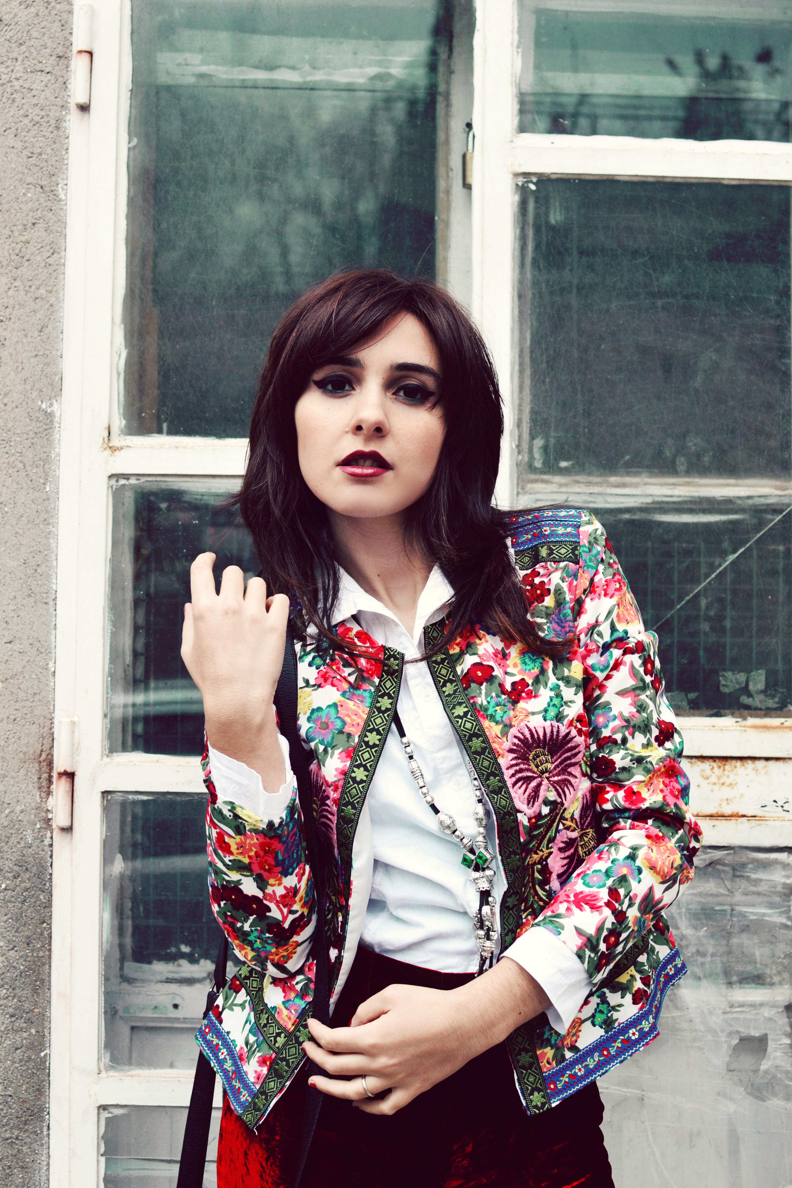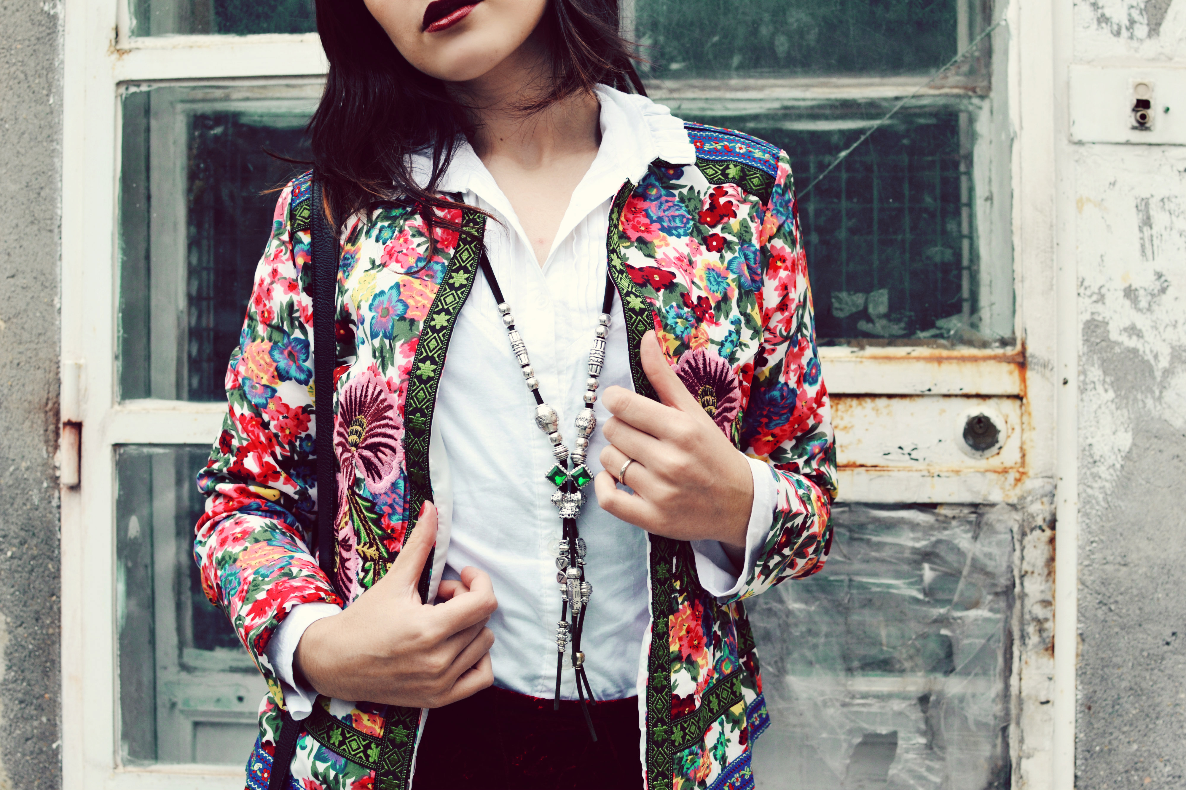 Velvet. Soft as a caress, like the scarlet passion. Velvet which falling, wraps, embracing…intense, saturated, violent red. Sometimes you just need a single, special piece to embellish everything. Embroidery, flowers, swirls, today I’m new, different, with this amazing and colorful Oasap jacket, that I love you so much to wear it also in this cold day. The winter is just around the corner, hidden behind the walls. Luckily, there are still flowers to remind us that all is not losttlost; Luckily, there are still the colors, the scents to old spring that never leave us. Because all I need is a flower to know that i will be happy again…