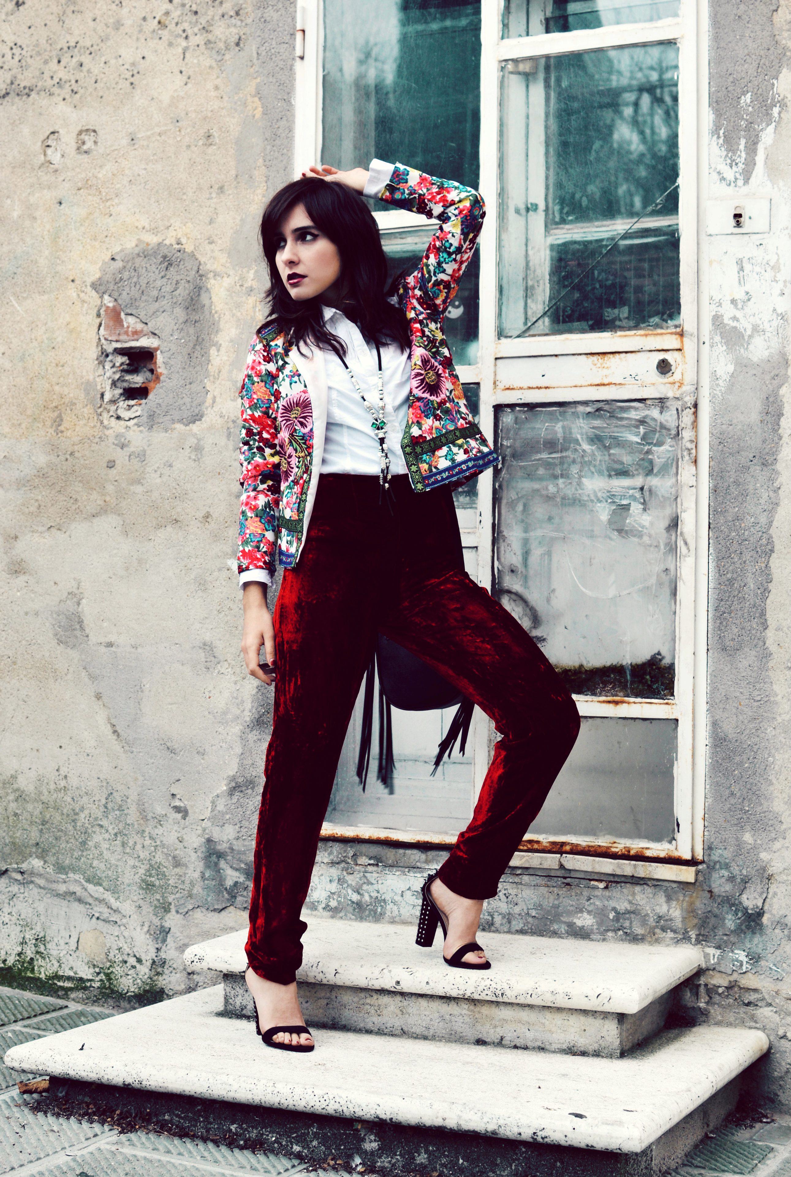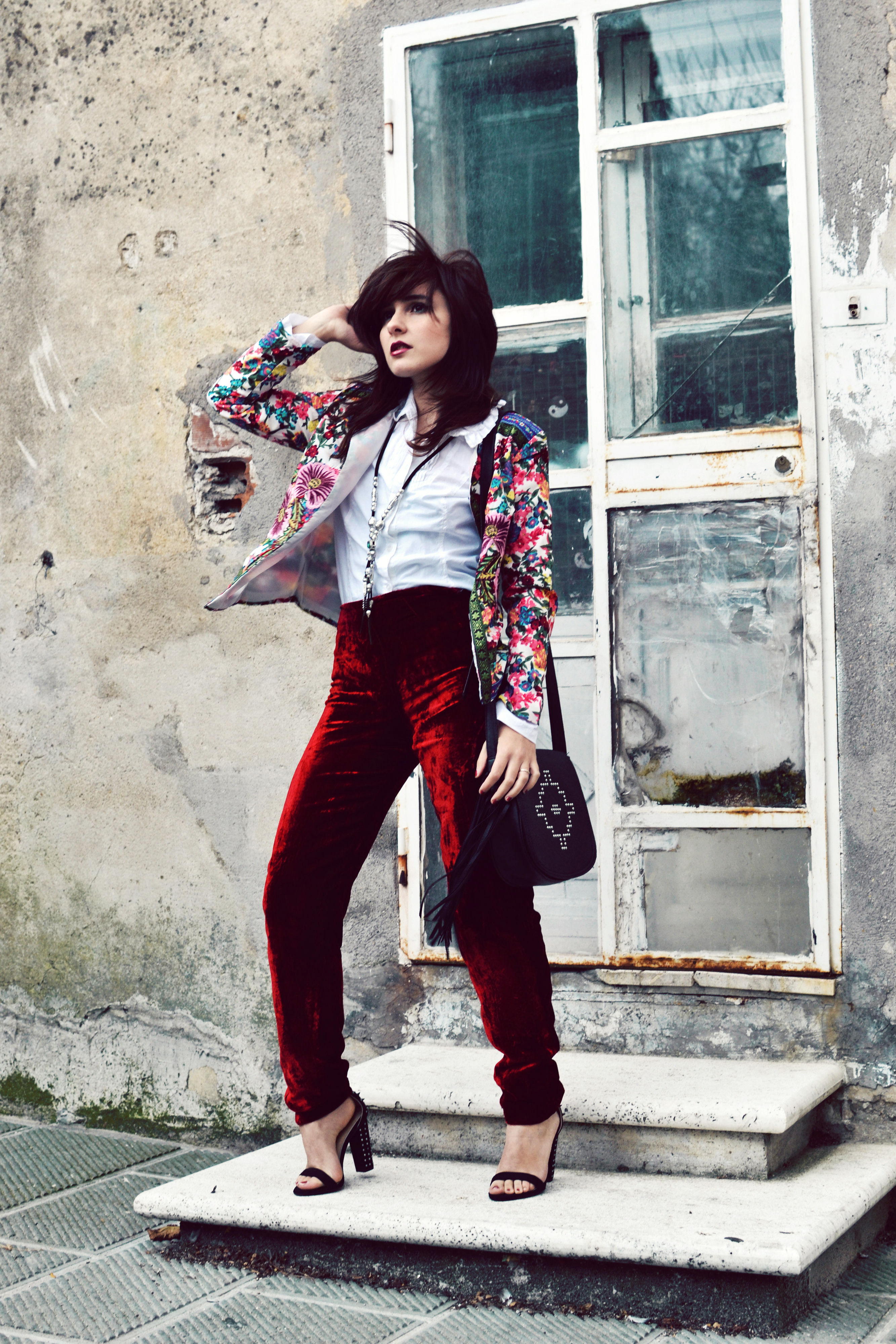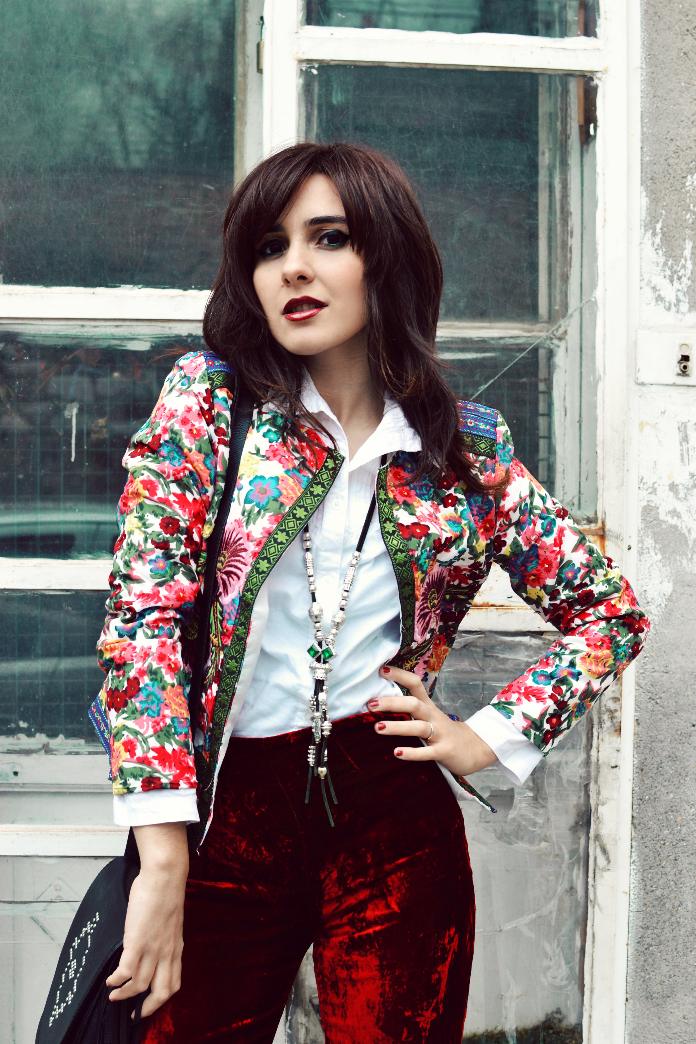 Andie Di Velvet Pants (similar HERE) | Oasap Flower Jacket | Zara Shoes | Terranova Bag | H&M Shirt