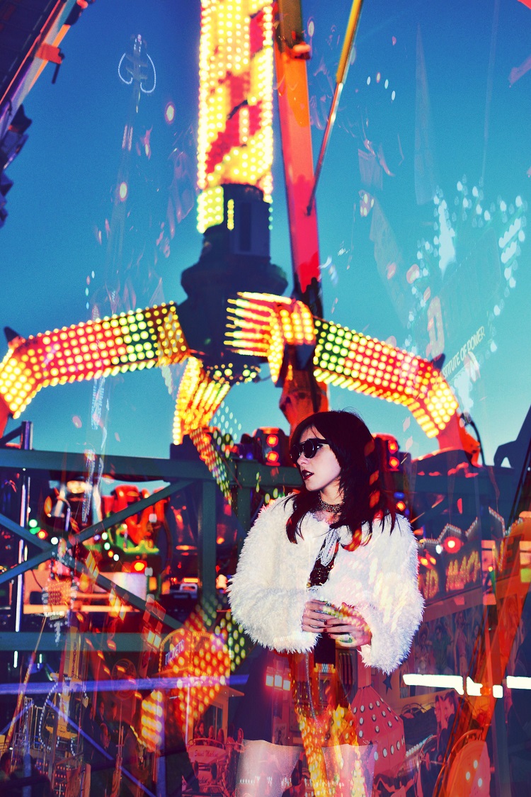 Quando i miei amici hanno visto in anteprima queste foto, hanno avuto una strana reazione. E’ difficile entrare nella mia testa, anche per chi mi conosce da sempre. Forse è proprio questo che mi piace. Qualche volta ho bisogno di cambiare, di fare qualcosa di folle, di uscire dai canoni e divertirmi a stravolgere il comune ordine delle cose. Il servizio di oggi fa parte delle eccezioni, non della regola, ed è stato concepito proprio così, a strati, a colori, al ritmo impazzito di una fantasia che non riesco a fermare. Bolle impazzite di plastica che si trasformano in luci e riflessi, che creano nuove geometrie e trasformano, in un’atmosfera quasi manga, un outfit stravagante in un tripudio di contaminazioni, aggiungendo particolari inattesi a degli scatti che più alternativi non si può. Salite con me su questa giostra impazzita…per la normalità c’è sempre tempo!