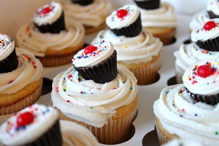 Tagliate a pezzetti il burro a temperatura ambiente e unirlo allo zucchero. Montare per bene gli ingredienti fino a formare una crema omogenea. Dopodiché unire le uova una alla volta mescolando per amalgamarle e poi unire il latte a temperatura ambiente a filo continuando a mescolare il tutto. Unire poi la farina setacciata, il sale, l’aroma di vaniglia e il lievito per ultimo. Imburrate ed infarinate 12 stampini monoporzione per muffins (io uso quelli di alluminio) e cuoceteli per cca 20′ a 180gradi nella parte centrale del forno. Abbassate ora la temperatura a 170gradi e cuocere ancora per 10′. Ora i vostri cupcakes sono pronti per essere decorati. Potete tagliare la parte superiore e scavarli internamente per riempirli con creme a vostro gusto oppure fare con un sac a poche dei cerchi concentrici di panna e decorare con codette o scaglie di cioccolato oppure con della pasta di zucchero o consumarli tali e quali con semplice zucchero a velo. Sono perfetti da fare con i bambini e danno largo alla fantasia…