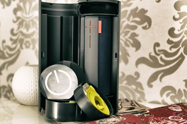 Quando acquisterete questo speaker vi arriverà a casa un tubo nero, molto elegante e ben curato, dall’aspetto fantascientifico! All’interno troviamo, perfettamente incastonato, lo speaker e due cassettini dove troverete il cavo micro USB, il trasformatore da 2A per la ricarica e un accessorio in gomma per proteggere da acqua e polvere gli ingressi dello speaker.