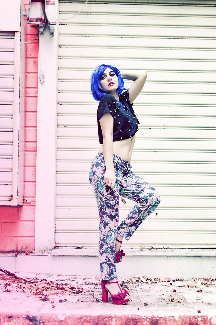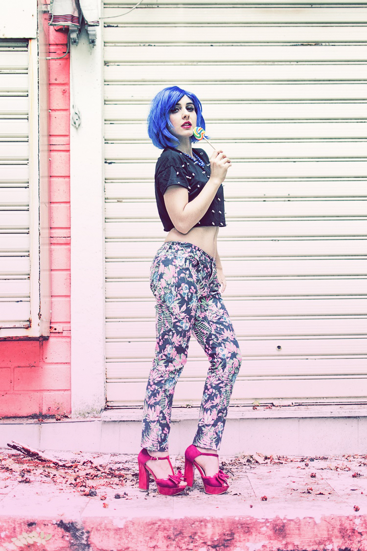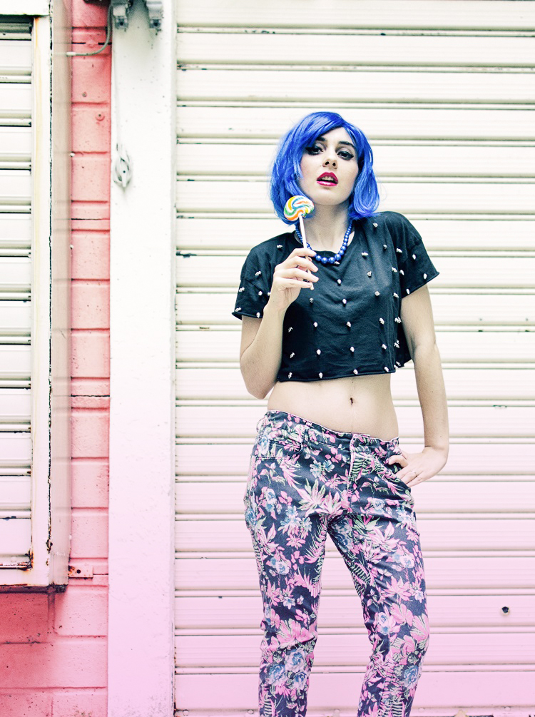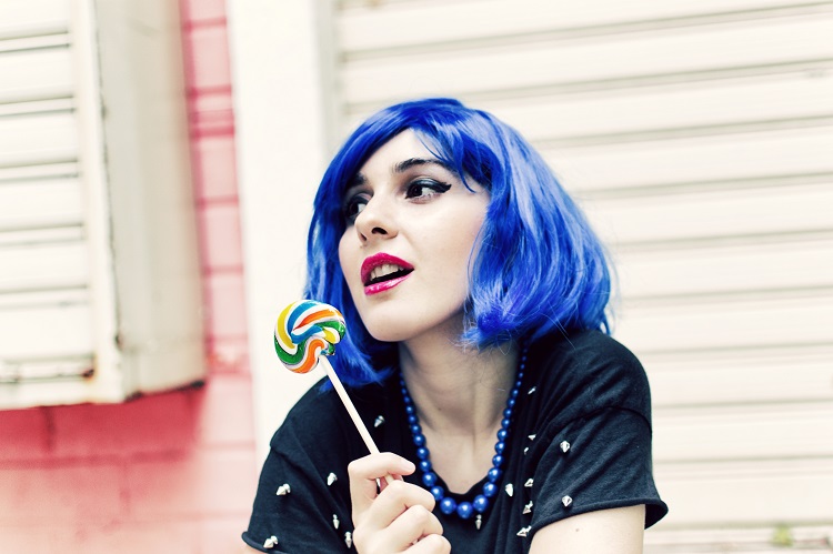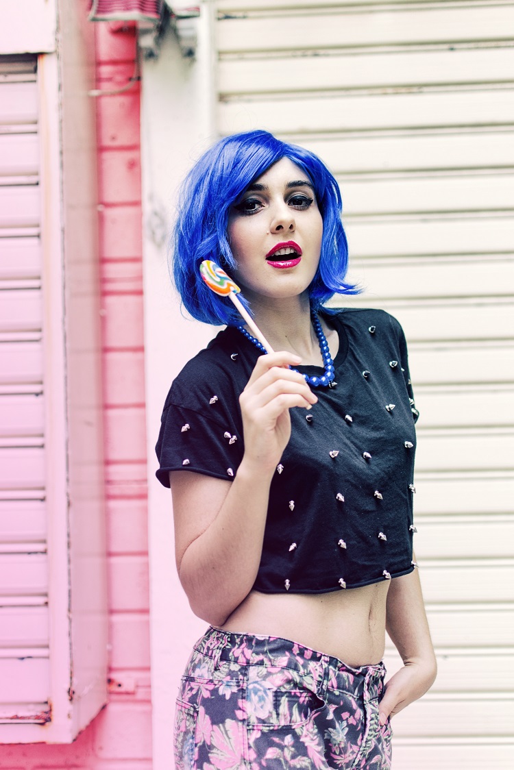 Prendi una parrucca blu e un look esplosivo, qualche borchia e un paio di tacchi super colorati, unisci insieme un pizzico di follia e irriverenza (e un bel lollipop variopinto) ed ecco pronto il nuovo mood di oggi! A metà tra il punk e il barbie style, ecco un outfit ispirato alla pop art fashion, impossibile da dimenticare. Perchè la parola d’ordine è sempre una: stupire. Basta poco per scatenare la fantasia, una location panna e fragola e il gioco è fatto! Allora che ne dite? come sto in blu? Ridere a volte è davvero la cura migliore!