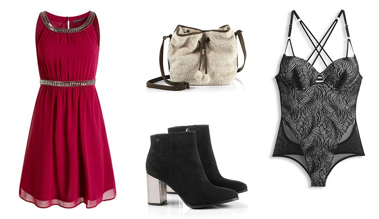Iniziamo con i capi che io personalmente indosserei subito. Stilare una lista dei desideri al femminile è piuttosto semplice! Basta mixare pezzi chiave e must di stagione. Come non abbandonarsi al fascino del rosso con l’arrivo sempre più imminente del Natale? Ecco spiegata la scelta di questo magnifico abito in chiffon con dettagli luccicanti e super chic, stupendo evergreen da utilizzare alle feste come nel resto dell’anno. Da abbinare con un cappotto super morbido in inverno e con un cerchietto bon ton e sandali d’estate, quest’abitino può essere il giusto passepartout per togliervi d’impiccio anche nelle situazione più difficili. Vogliamo parlare poi della bellezza dell’effetto pelliccia d’inverno? Si a quelle ecologiche, calde, eleganti e super glamour: tre aggettivi che descrivono alla perfezione questa borsa secchiello, un vero must per chi non vuole rinunciare ad essere alla moda neanche in inverno. Un regalo perfetto per lei (ma anche per lui) è invece la lingerie raffinata, come questo body in pizzo, da indossare per stupire e per stupirsi. Ultime e non ultime le boots con tacco metallizzato: sono o non sono il sogno di ogni shoes addicted? Semplicemente meravigliose!