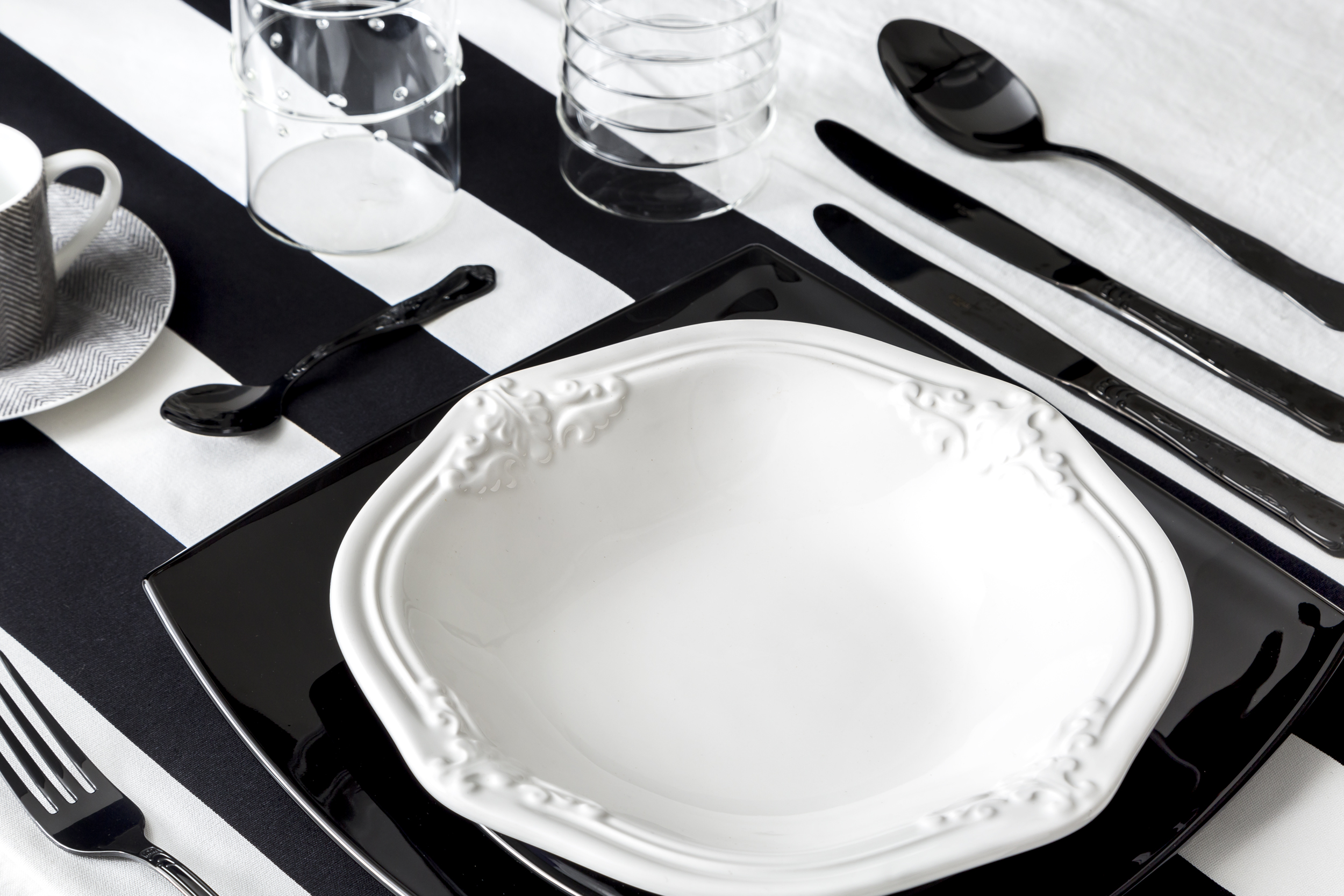 Adoro il black and white, anche quando si tratta di design da tavola. Merigliosi i piatti e i loro contrato. Un saluto, Daniela.