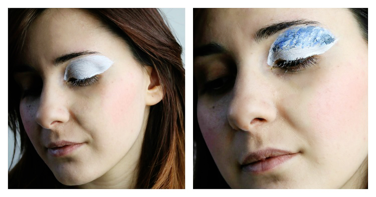 - Iniziate a dare le prime pennellate di colore servendovi del blu e applicandolo dalla linea interna tra le due palpebre e su quella fissa. Per creare l’azzurro mescola il blu con il bianco.